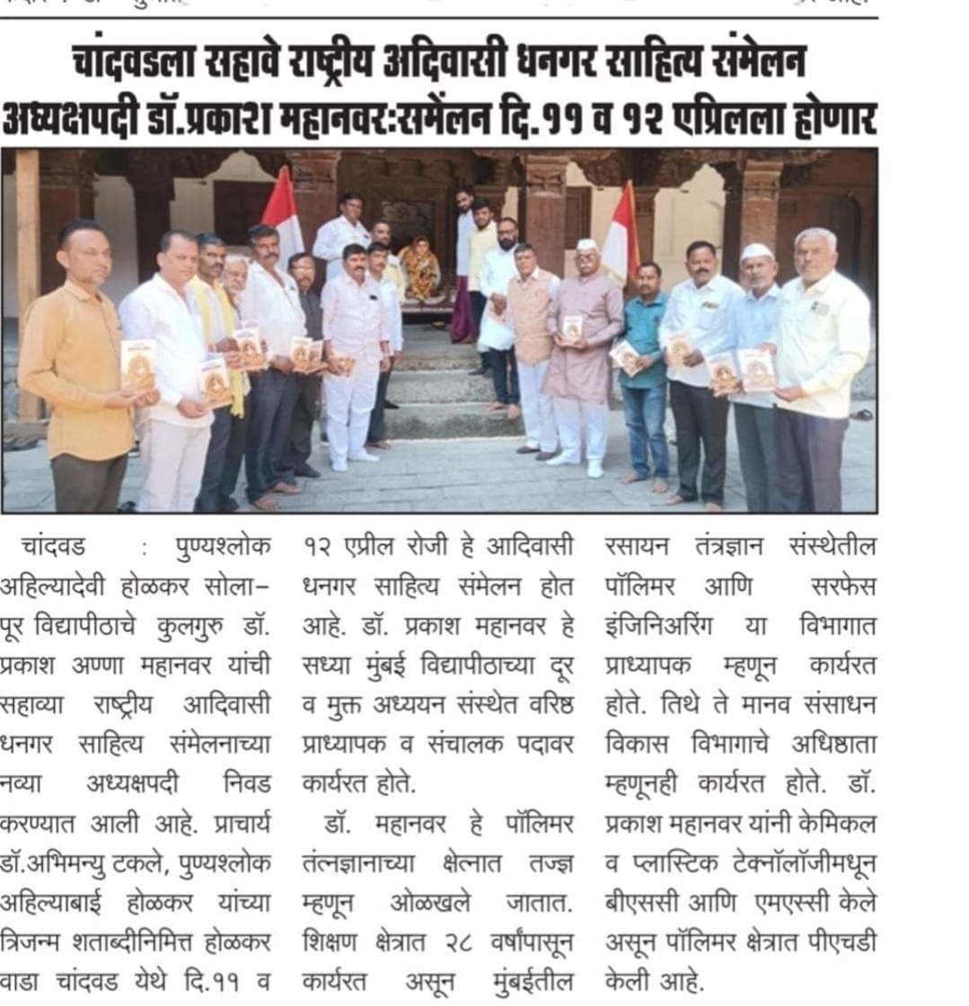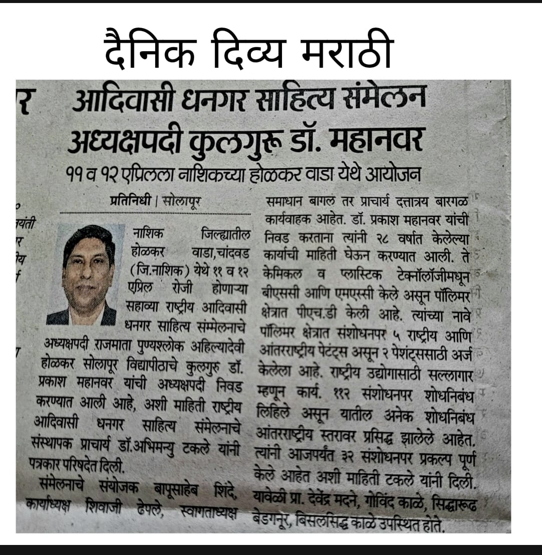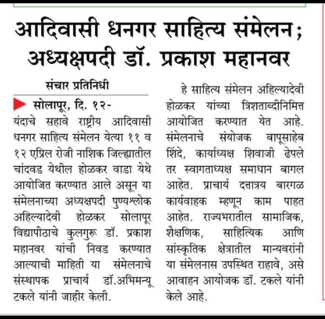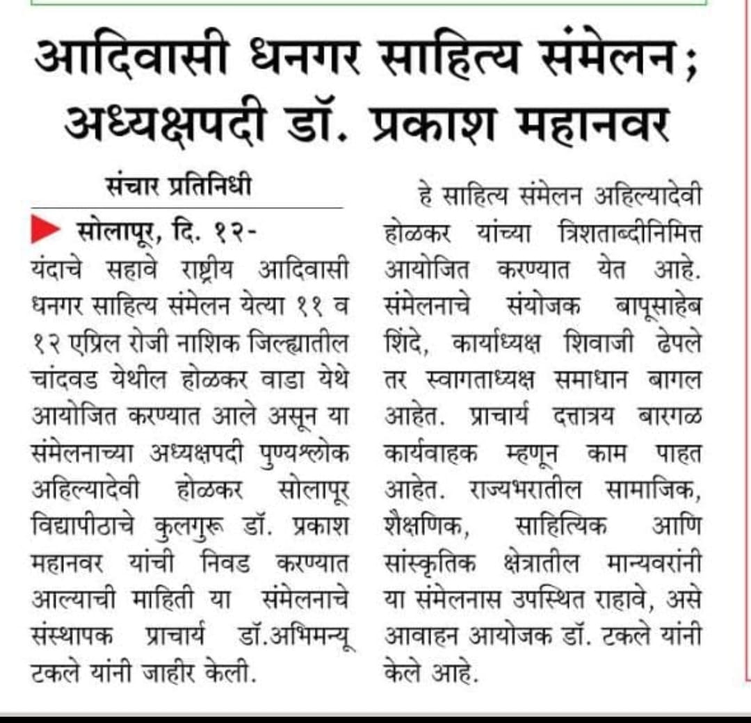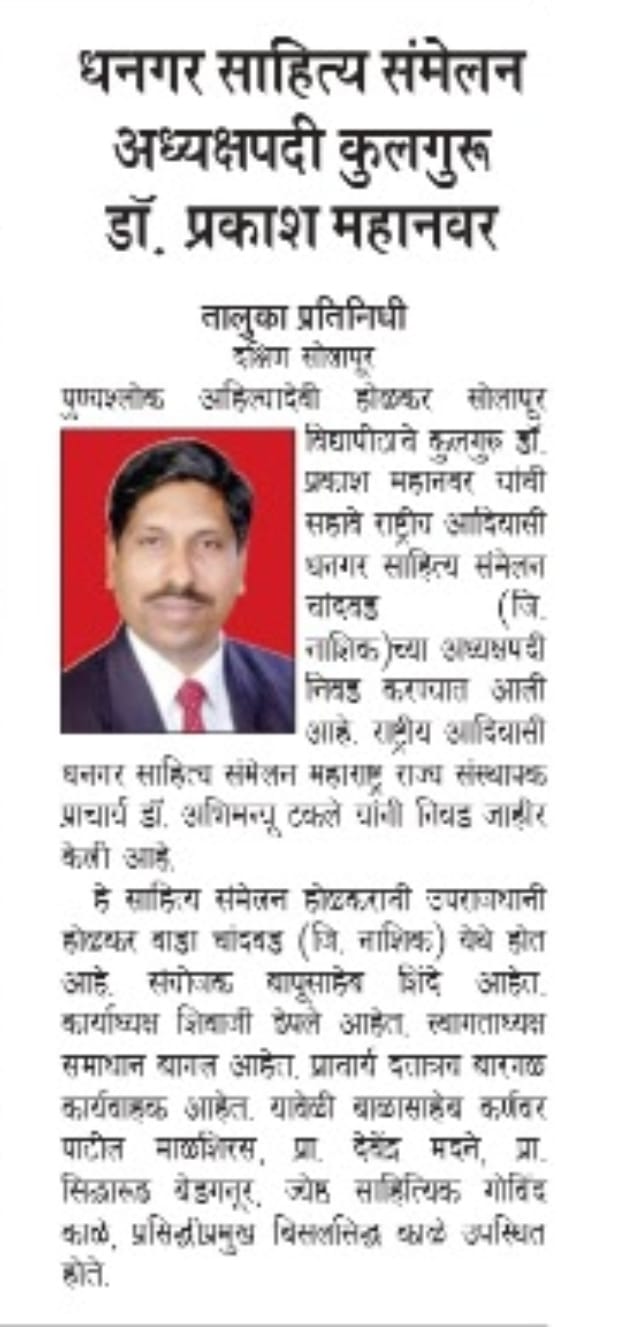 मा.प्रा.डाॅ.प्रकाश महानवर कुलगुरू पुण्यश्लोक अहल्यादेवी होळकर विद्यापीठ सोलापूर विद्यापीठ सोलापूर यांची सहावे राष्ट्रीय आदिवासी धनगर साहित्य संमेलन होळकर वाडा (रंग महाल) महाराष्ट्र राज्य च्या अध्यक्ष पदी निवड करण्यात आली आहे .याची प्रचंड अशी दखल प्रिंट मिडीयाने घेतलेली आहे.