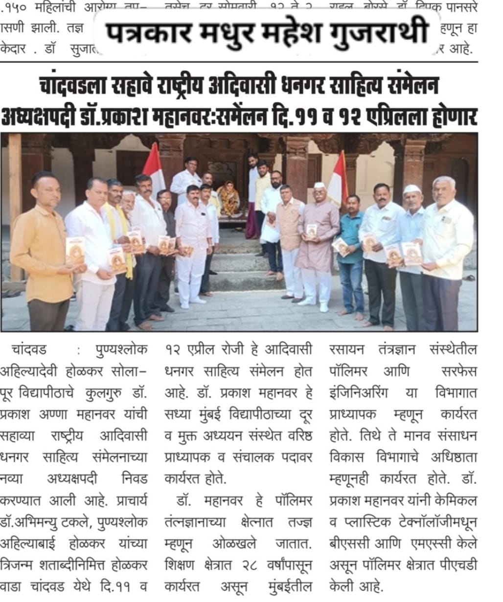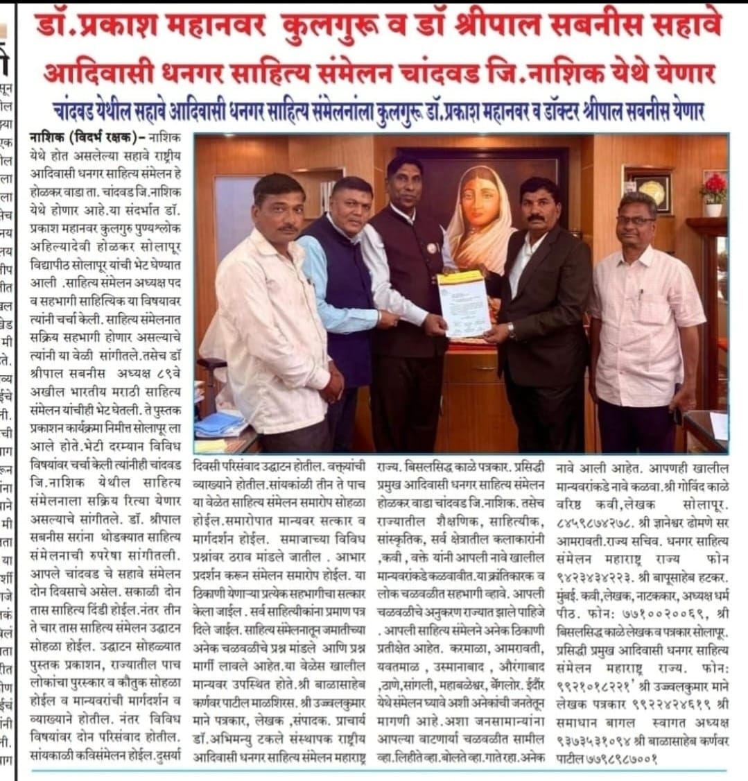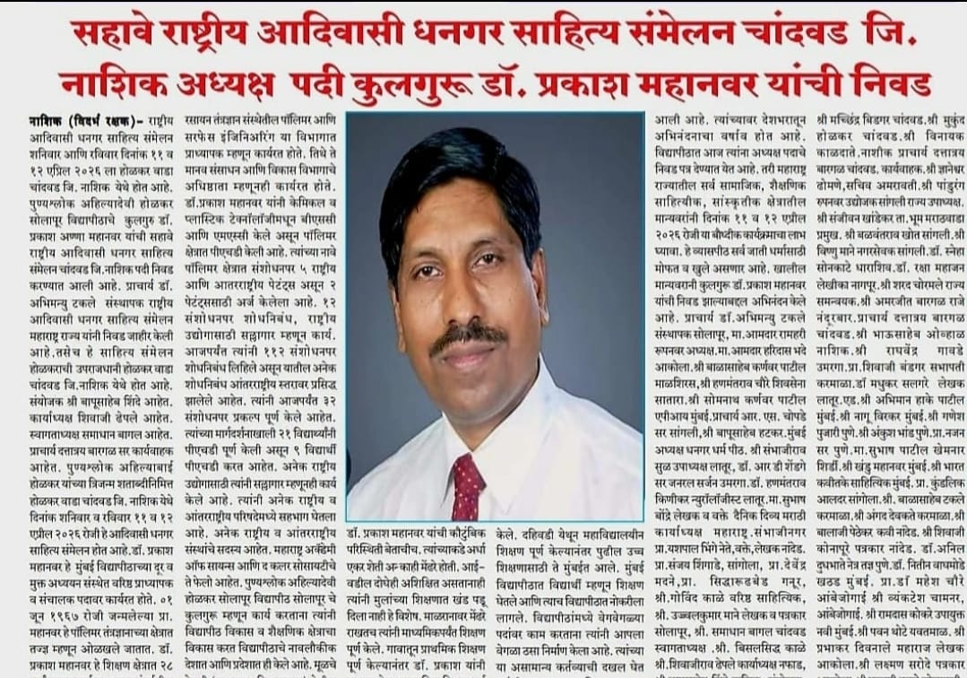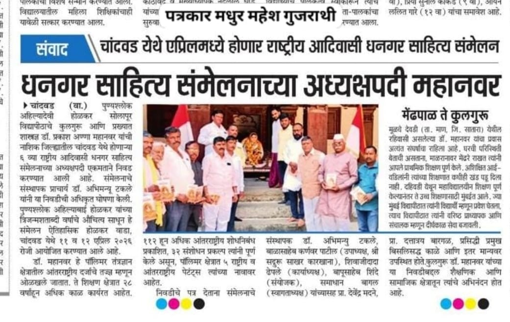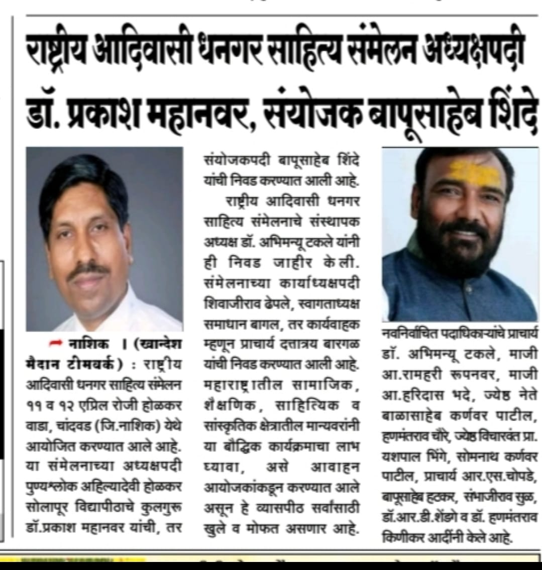 मा.प्रा.डाॅ.प्रकाश महानवर कुलगुरू पुण्यश्लोक अहल्यादेवी होळकर विद्यापीठ सोलापूर विद्यापीठ सोलापूर यांची सहावे राष्ट्रीय आदिवासी धनगर साहित्य संमेलन होळकर वाडा (रंग महाल) महाराष्ट्र राज्य च्या अध्यक्ष पदी निवड करण्यात आली आहे .याची प्रचंड अशी दखल प्रिंट मिडीयाने घेतलेली आहे.