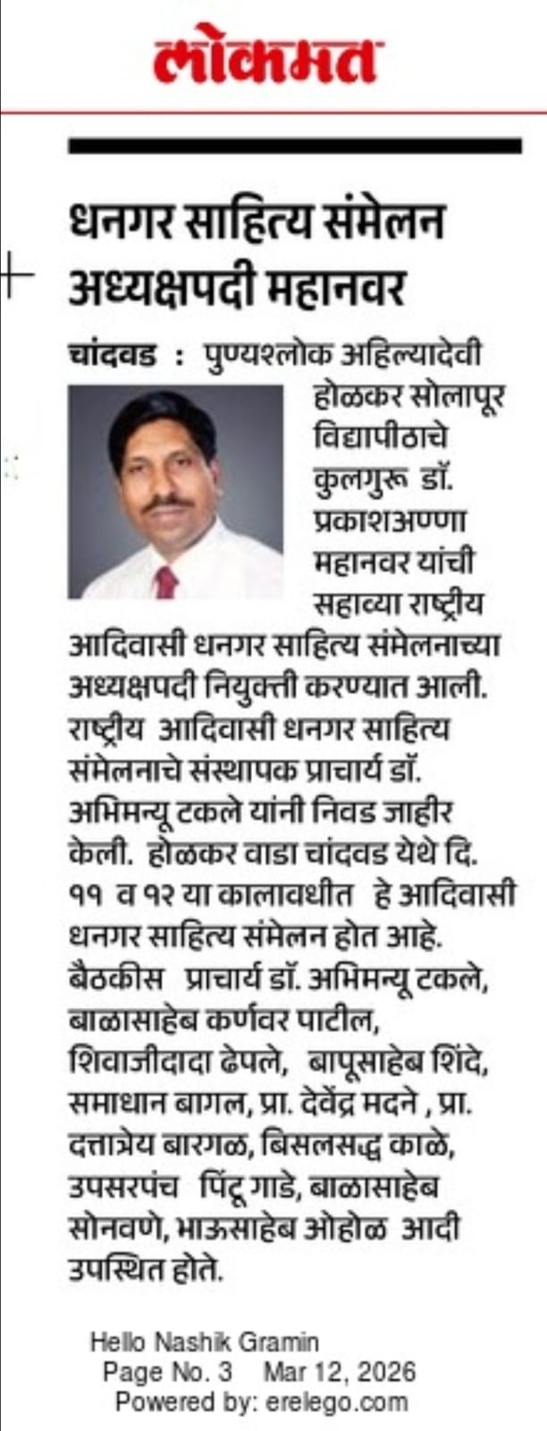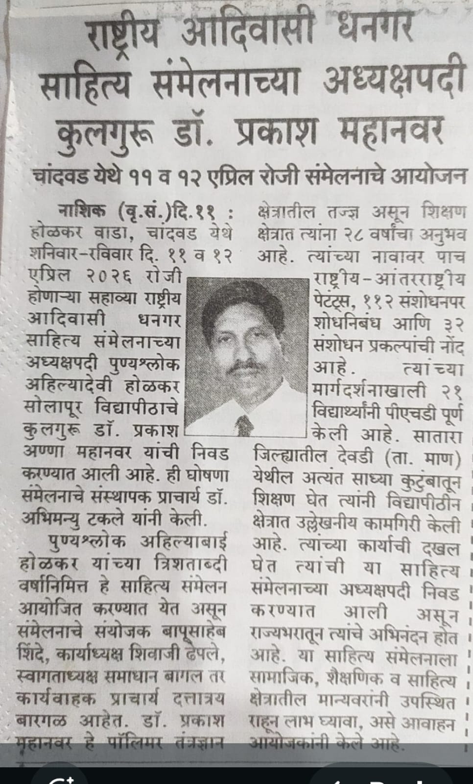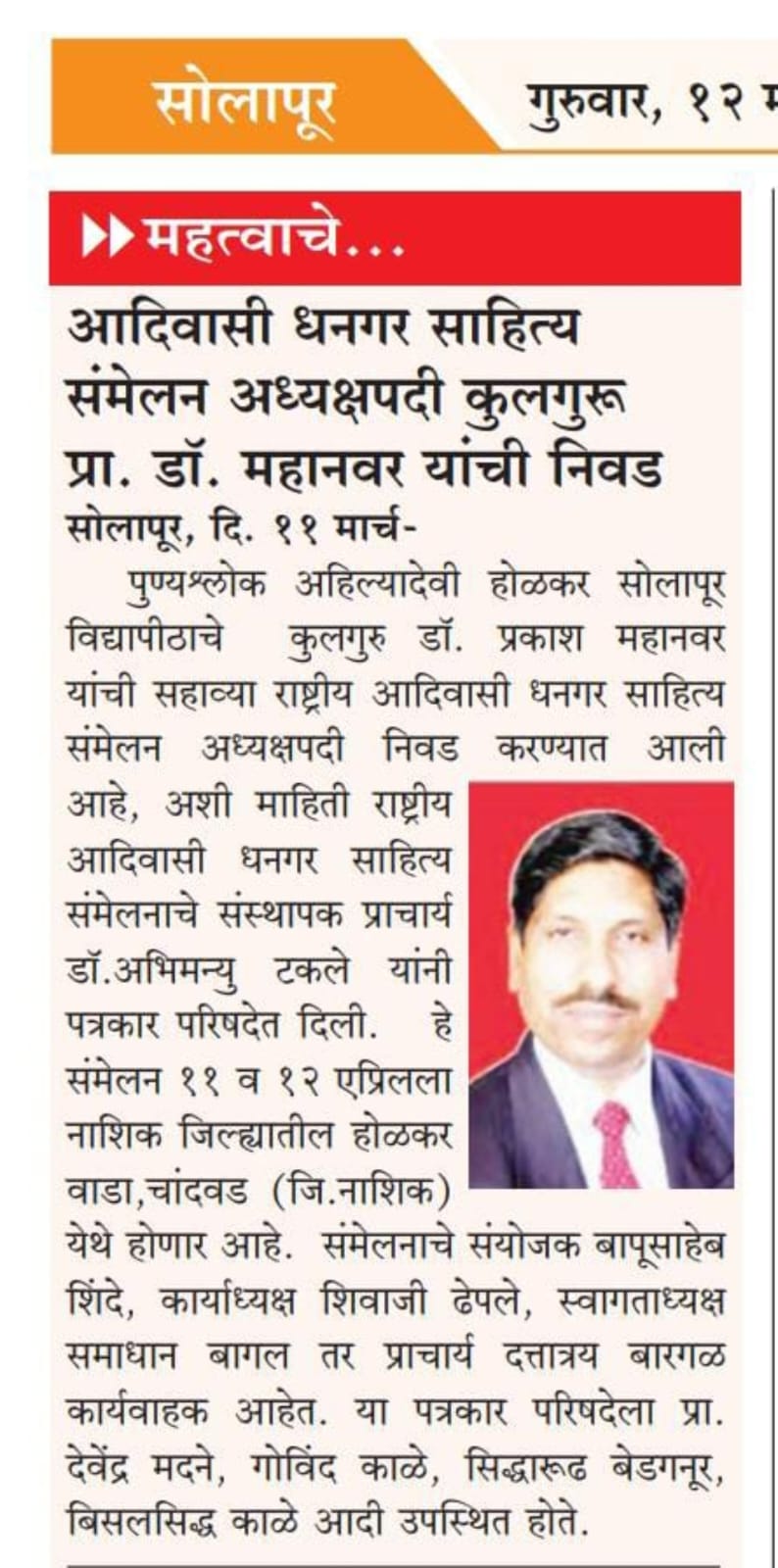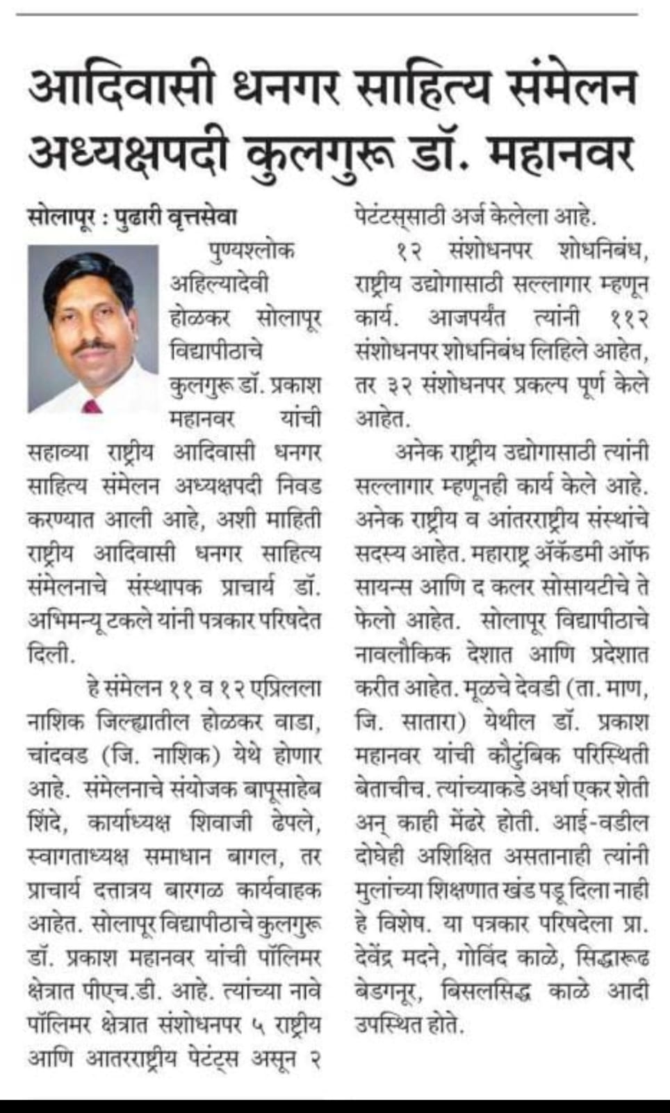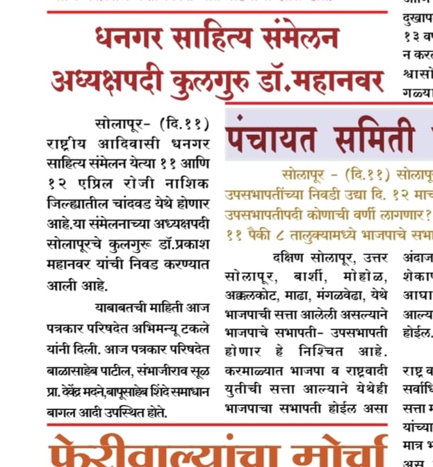 मा.प्रा.डाॅ.प्रकाश महानवर कुलगुरू पुण्यश्लोक अहल्यादेवी होळकर विद्यापीठ सोलापूर विद्यापीठ सोलापूर यांची सहावे राष्ट्रीय आदिवासी धनगर साहित्य संमेलन होळकर वाडा (रंग महाल) महाराष्ट्र राज्य च्या अध्यक्ष पदी निवड करण्यात आली आहे .याची प्रचंड अशी दखल प्रिंट मिडीयाने घेतलेली आहे.