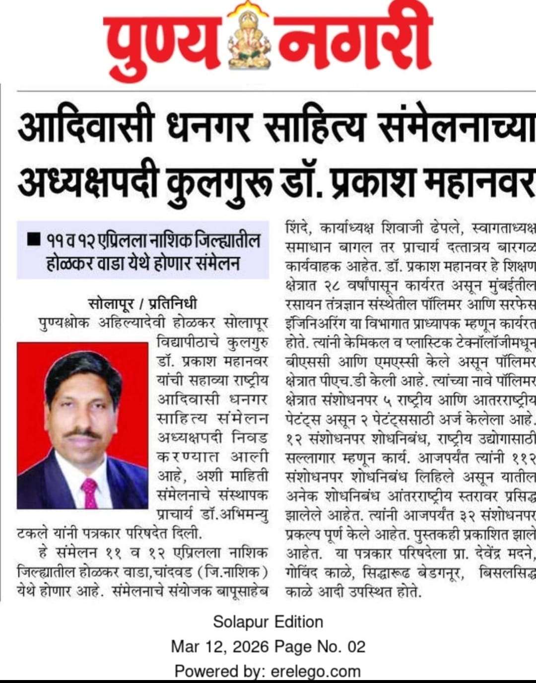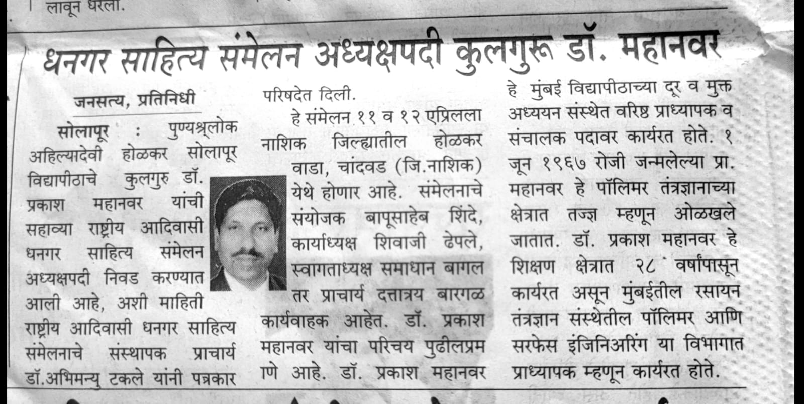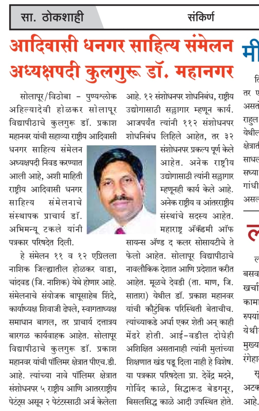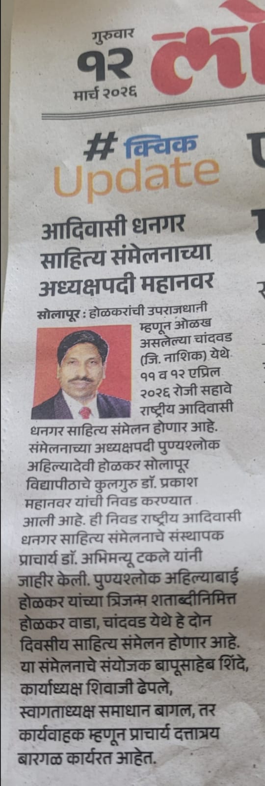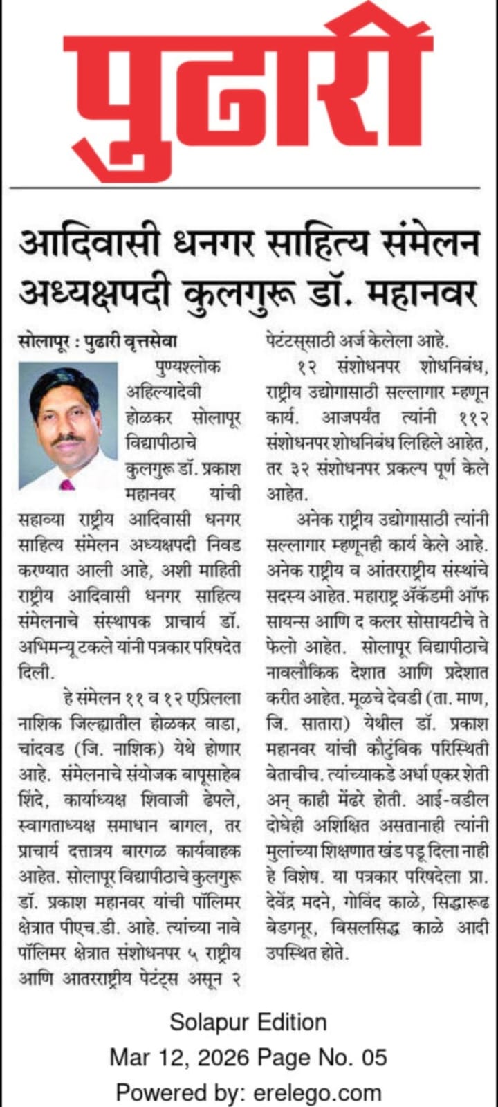 मा.प्रा.डाॅ.प्रकाश महानवर कुलगुरू पुण्यश्लोक अहल्यादेवी होळकर विद्यापीठ सोलापूर विद्यापीठ सोलापूर यांची सहावे राष्ट्रीय आदिवासी धनगर साहित्य संमेलन होळकर वाडा (रंग महाल) महाराष्ट्र राज्य च्या अध्यक्ष पदी निवड करण्यात आली आहे .याची प्रचंड अशी दखल प्रिंट मिडीयाने घेतलेली आहे.